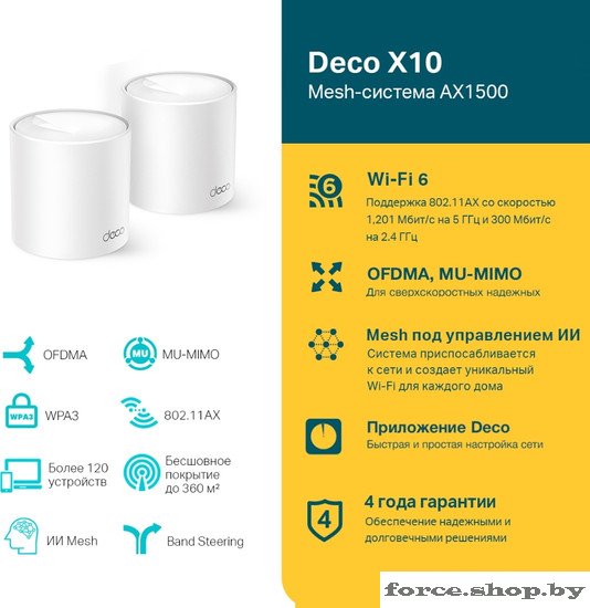 | Информация | ? Два диапазона Wi-Fi 6: до 300 Мбит/с на диапазоне 2,4 ГГц, до 1201 Мбит/с на диапазоне 5 ГГц. ? Технологии OFDMA и MU-MIMO: позволят подключить в четыре раза больше устройств одновременно. ? Бесшовное покрытие: Wi-Fi 6 позволит создать надёжный сигнал во всём доме. ? Сверхнизкая задержка: мгновенный отклик в онлайн-играх и отсутствие подвисаний при общении по видео. ? Единая сеть: при перемещении по дому мобильное устройство будет автоматически подключаться к модулю с наиболее качественным сигналом. ? Родительский контроль: создайте собственный профиль для каждого члена семьи, а также ограничивайте время пребывания в сети и блокируйте непристойные сайты. ? Простая настройка: благодаря пошаговым указаниям в приложении Deco. |