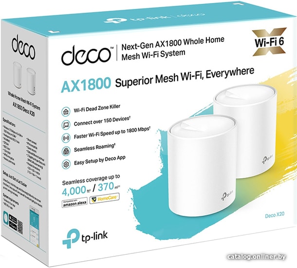 | Информация | Несколько модулей формируют единую домашнюю сеть, которая обеспечивает наилучшее подключение при передвижении по дому. Если необходимо увеличить покрытие можно добавить в сеть больше модулей.Deco X20 поддерживает технологии MU-MIMO, OFDMA и 1024-QAM Deco X20, которые позволяют значительно повысить производительность беспроводной сети. Технологии OFDMA и MU-MIMO увеличивают пропускную способность в 4 раза для подключенных устройств.Поддерживает Amazon Alexa, для управления с помощью голосовых команд. |