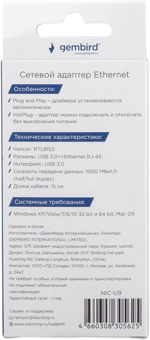 Сетевой адаптер Gembird NIC-U9