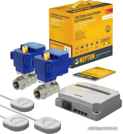 | Комплектация | Модуль управления Neptun Base-1штДатчик контроля протечки воды SW005-3 штКран шаровый с электроприводом серии NEPTUN BUGATTI PRO 220В-2шт |