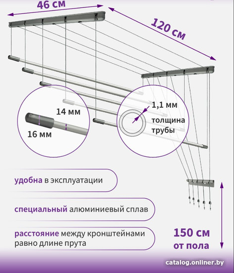| Информация | ? Новая потолочная сушилка для белья Comfort Alumin Group от белорусского производителя представляет собой эксклюзивную модель из 5 усиленных алюминиевых прутьев с высокотехнологичным и экологичным покрытием в стильном дизайне. ? Усиленные сушильные прутья из уникального анодированного алюминиевого сплава не ржавеют, не трескаются, не деформируются и возвращаются в исходное состояние после любой нагрузки. ? Анодирование создает защитную оксидную пленку, увеличивая устойчивость к коррозии и обеспечивая долговечность. ? Алюминиевые прутья легче стальных, увеличивая срок службы сушилки для белья. ? Увеличена максимальная нагрузка сушилки и ее размерный ряд, а алюминий — экологически чистый материал. ? Серый и серебристо-серый цвет придают потолочной сушилке изысканный внешний вид, который сочетается с любым интерьером. ? Подъемный механизм делает сушилку многоуровневой, а на этикетке подробная инструкция по установке. ? В комплекте входят метизные изделия и фиксатор нити универсальной длины. ? Многофункциональная стильная сушилка для белья подойдет для различных помещений и обеспечит дополнительное место хранения. |