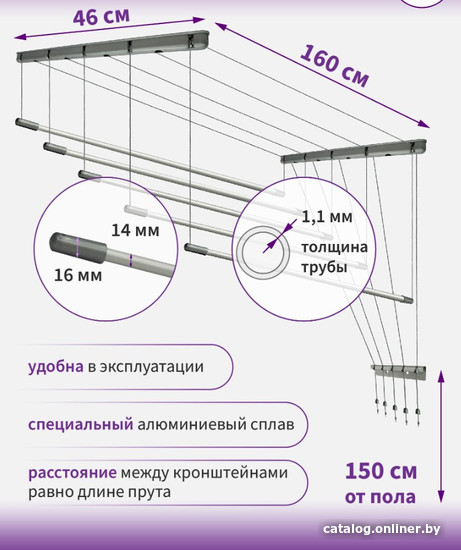 | Информация | ? Новая потолочная сушилка для белья Comfort Alumin Group от белорусского производителя представляет собой эксклюзивную модель из 5 усиленных алюминиевых прутьев с высокотехнологичным и экологичным покрытием в стильном дизайне. ? Усиленные сушильные прутья-трубки диаметром 14 мм из уникального анодированного алюминиевого сплава не ржавеют, не трескаются, не деформируются и возвращаются в исходное состояние после любой нагрузки. ? Анодирование создает защитную оксидную пленку, увеличивая устойчивость к коррозии, атмосферным воздействиям и обеспечивает долговечность. ? Алюминиевые прутья в 2.5 раза легче стальных, увеличивая срок службы сушилки для белья. ? Увеличены максимальная нагрузка сушилки для белья (на прут ? 4 кг, на сушилку ? 20 кг) и ее размерный ряд (100–300 см с шагом 10 см). ? Металлическая сушилка для белья из труб не оставляет на белье заломов и складок ? его легко гладить. ? Анодированный алюминий — экологически чистый материал, не выделяет вредные вещества даже при высокой температуре и влажности. ? Серый и серебристо-серый с металлическим блеском цвет комплектующих придаёт потолочной сушилке изысканный внешний вид. ? Потолочные планки подвесной сушилки, направляющие ролики, колпачки на прутья и нити сделаны из ударопрочного АБС-пластика, устойчивого к ультрафиолету, механическим повреждениям и нагрузке. ? Фиксатор нити усиленный, металлический (сталь), с антикоррозийным покрытием. ? Специальная прочная полиамидная нить толщиной 1.1 мм усилена сердечником, устойчива к растяжению, истиранию, влаге, гниению, плесени. ? Подъемный механизм типа «Лиана» («Лифт») делает потолочную сушилку многоуровневой. ? В комплекте метизные изделия: саморезы, дюбели. ? Фиксатор нити длиной 11.5 см универсален: 7 пазов для нити ? подходит для сушилок на 5–7 прутьев; может крепиться и на правую, и на левую стену на высоте около 150 см от пола. ? В комплекте 5 нитей длиной 5 м и 5 — длиной 3 м. ? Д-Ш-В потолочных крепежных планок: 46?3?2.5 см. В каждой планке 5 направляющих нить роликов с шагом 10 см и 4 отверстия для крепления к потолку на расстоянии 10 см друг от друга. ? Производитель выпускает комплекты для ремонта сушилки. ? Многофункциональная стильная сушилка для белья подойдет для использования в различных помещениях и обеспечит быстрое высыхание белья. |