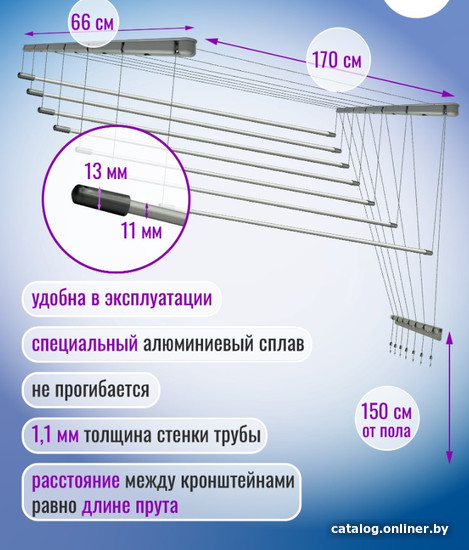 | Информация | ? Потолочная сушилка для белья Comfort Alumin Group Silver Style 170см (алюминий) — эффективная, удобная и надежная модель с увеличенной сушильной поверхностью, высокотехнологичным экологичным покрытием прутьев и элегантным стильным дизайном. Размерный ряд от 100 до 250 см с шагом 10 см. ? Размер сушильной поверхности увеличен в 1.4 раза: состоит из 7 прутьев вместо 5, что позволяет сушить больше белья одновременно. ? Анодированный алюминий создает защитную оксидную пленку, увеличивая устойчивость к коррозии и обеспечивая долговечность. ? Сушилка выдерживает нагрузку до 21 кг и не оставляет заломов и складок на белье. ? Легкий и экологически чистый материал, алюминий, делает сушилку удобной и долговечной. ? Потолочные крепежные планки и фиксатор нити изготовлены из ударопрочного материала, устойчивого к ультрафиолету и механическим повреждениям. ? Подъемный механизм типа «Лиана» делает сушилку многоуровневой, обеспечивая быстрое и качественное высыхание белья. ?? Не комплектуется метизными изделиями. ? Многофункциональная стильная сушилка для белья, которая легко вписывается в интерьер и обеспечивает быстрое высыхание белья. |