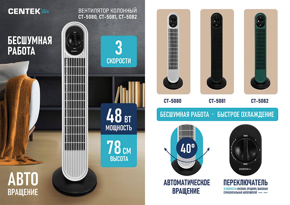 | Информация | -Колонный вентилятор CENTEK CT-5082 - современное климатическое устройство, созданное для эффективного и комфортного охлаждения воздуха в помещении. Благодаря вертикальному форм-фактору, вентилятор не занимает много места и может быть установлен практически в любом уголке комнаты, не загромождая пространство. -Корпус выполнен из высококачественного пластика, который отличается приятной на ощупь поверхностью и простотой ухода. Встроенная ручка облегчает перемещение вентилятора между разными зонами, что делает использование максимально удобным для пользователя. -Модель обладает мощностью 48 Вт и тремя скоростями обдува, что позволяет быстро подобрать наиболее подходящий режим для любого времени суток или температуры. Автоматическое вращение обеспечивает равномерное распределение прохладного воздуха по всему помещению. -Интуитивное механическое управление делает эксплуатацию вентилятора простой, даже для пользователей без опыта. Колонный вентилятор CENTEK CT-5082 - это оптимальное сочетание функциональности, стиля и надежности для создания комфортного микроклимата в доме или офисе. |
