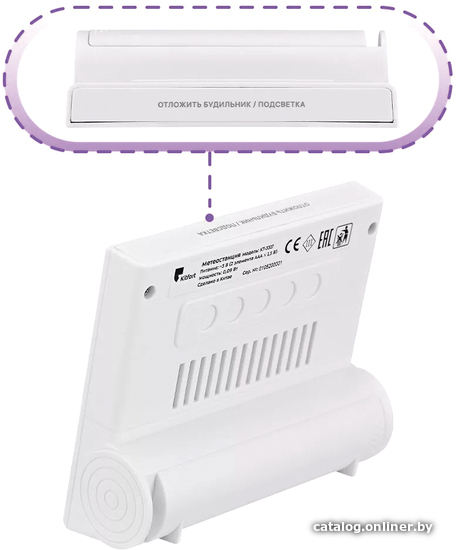 | Информация | Метеостанция KT-3317 — это прибор, который позволит следить за показаниями температуры и влажности в помещении и на улице. Также KT-3317 показывает время и может служить будильником. Сигнал будильника можно отложить на 5 минут. Вы поймете, когда нужно проветрить комнату или стоит закрыть окно, благодаря индикатору «Окно». Индикатор изменения влажности использует показания влажности в помещении и на улице, чтобы показать, как проветривание повлияет на влажность в помещении. У прибора цветной дисплей, на котором хорошо видны все необходимые значения. Подсветку можно включить на 10 секунд. Благодаря стильному дизайну и компактному размеру метеостанция легко впишется в ваш интерьер. Данная модель оснащена одним датчиком для получения показаний температуры и влажности на улице. Датчик можно повесить на стену, для этого предусмотрено отверстие для настенного крепления. Метеостанция работает от 2 щелочных батареек типа AAA (не входят в комплект), благодаря чему ее можно расположить в любом удобном для вас месте. Устройство устойчиво стоит на столе благодаря широкому основанию. |