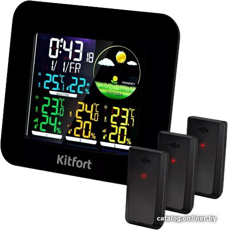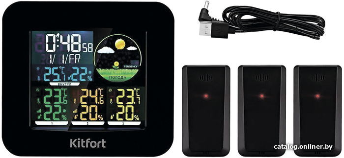 | Информация | Метеостанция KT-3321 — это прибор, который позволит следить за показаниями температуры и влажности в помещении и на улице, погодой. Устройство прогнозирует погодные условия на ближайшие 12–24 часа на основе изменения атмосферного давления. Также KT-3321 показывает время, дату, день недели и может служить будильником. Сигнал будильника можно отложить на 5 минут. Благодаря стильному дизайну и компактному размеру метеостанция легко впишется в ваш интерьер. У данного устройства цветной экран, на котором хорошо видны все необходимые значения. Подсветка имеет 3 уровня яркости. Прибор оснащен 3 датчиками для получения показаний t и влажности на улице или в двух других помещениях: детской комнате, теплице или погребе. Датчики можно повесить на стену. Питание датчика происходит от 2 батареек типа AAA (не входят в комплект). Кнопкой «Подсветка» можно переключать яркость дисплея и отложить сигнал будильника на 5 минут. Кнопка «Настройка» осуществляет переход к настройке параметров. Длительным нажатием на кнопку «Датчик» осуществляется поиск каналов для подключения к датчикам. Метеостанция может работать через USB-шнур или от 3 щелочных батареек типа AAА (не входят в комплект). Прибор можно повесить на стену или поставить на стол. На задней части устройства расположены отверстия для настенного крепления и складные ножки. Метеостанция показывает максимальные и минимальные значения температур и влажности за сутки, тенденцию изменения температуры, влажности и атмосферного давления: повышение, понижение, без изменений. |