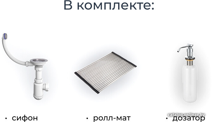 | Комплектация | Сифон, дозатор для жидкого мыла (нерж) и ролл-мат |