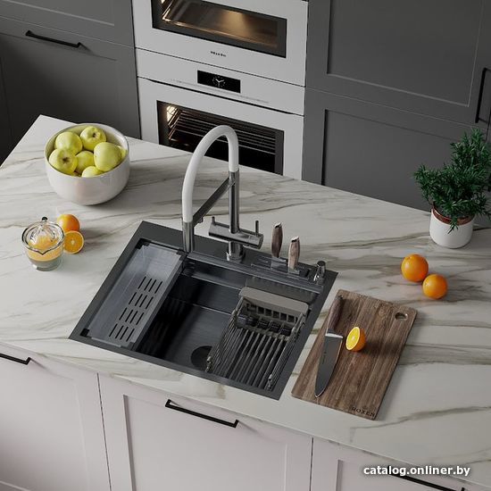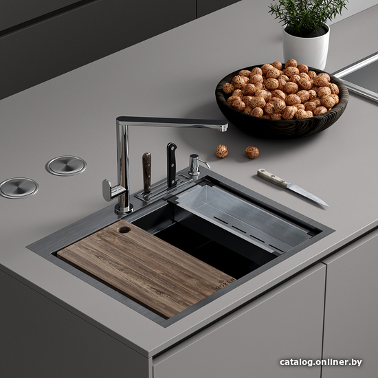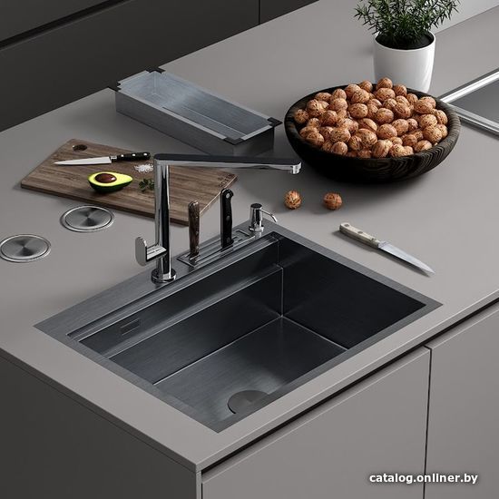 | Комплектация | сифон, держатель для ножей, разделочная доска, корзина из нержавеющей стали, коландер телескопический, дозатор для моющих средств, 2 заглушки на отверстия, комплект креплений к столешнице |