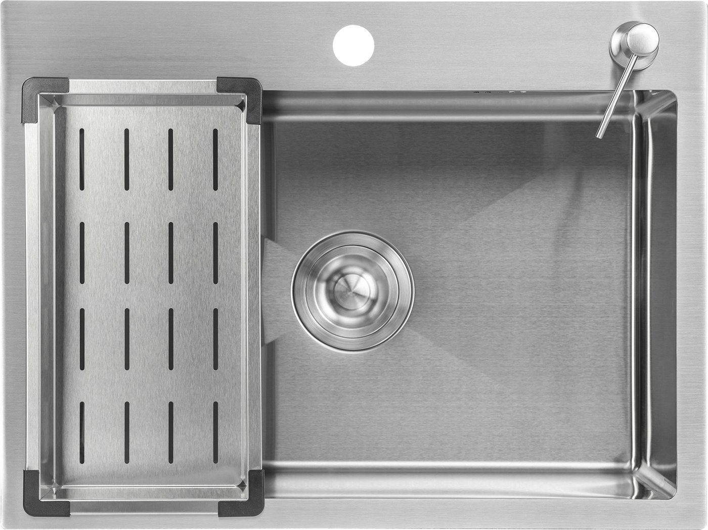 Кухонная мойка Saniteco 6045 + Spike F9S07011 (сатин, с сифоном, дозатором и коландером)