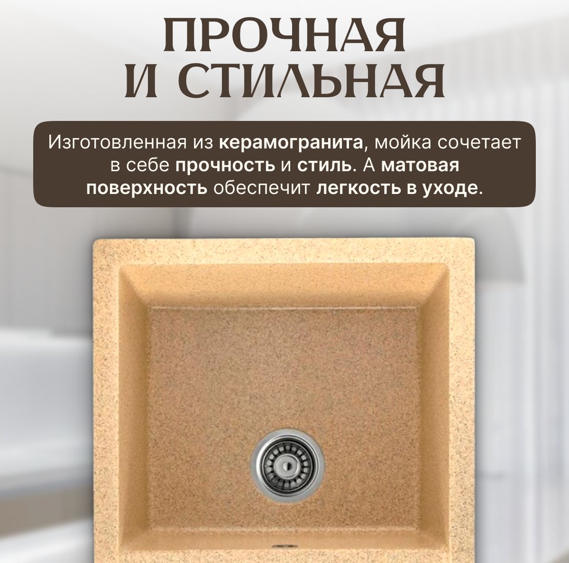 | Информация | - Мойка кухонная Fortis — это элегантное и практичное решение для вашей кухни, создающее удобное рабочее пространство. Изготовленная из керамогранита, она отличается высокой прочностью и устойчивостью к повреждениям, что делает её идеальной для повседневного использования. Прямоугольная форма и матовая бежевоя поверхность, имитирующая песок, придают мойке теплый и стильный вид. |