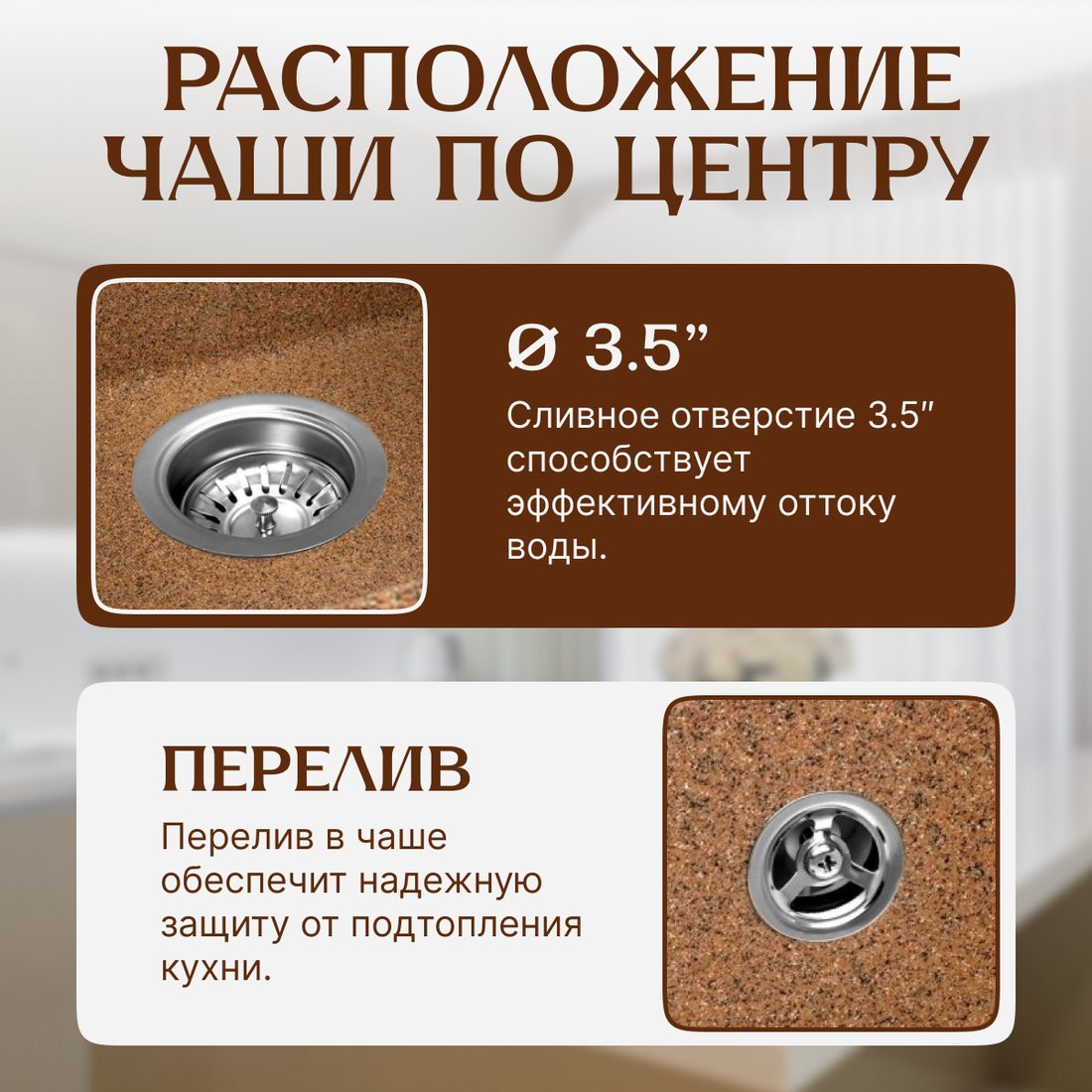 | Информация | - Мойка кухонная Terra — это стильное и функциональное решение для вашего кухонного пространства. Изготовленная из керамогранита, она сочетает прочность и долговечность, что делает её идеальным выбором для любой кухни. |