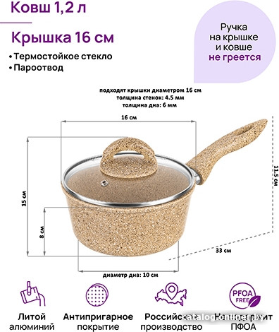 | Информация | ? Ковш «Медовый гранит» из серии «Гармония вкуса» равномерно разогревается и сохраняет вкус и полезные свойства продуктов благодаря толстостенному литому алюминию и ультрапрочному двухслойному антипригарному покрытию Cookmark. ? Покрытие устойчиво к царапинам, безопасно для здоровья и не содержит вредных веществ. ? Ковш имеет стильный дизайн, имитирующий гранит, и жаропрочную стеклянную крышку с пароотводом. ? Удобная ручка обеспечивает быструю подачу приготовленной пищи на стол. ? Подходит для всех типов плит, кроме индукционных. ? Эксплуатация: не нагревать без продуктов, использовать только деревянные и силиконовые приборы, не мыть абразивными или щелочными моющими средствами. ? Ковш станет отличным подарком для женщин и придаст процессу приготовления пищи новый уровень комфорта. ? В серии «Гармония вкуса» также представлены сковороды, кастрюли, блинницы, казаны и жаровни. |