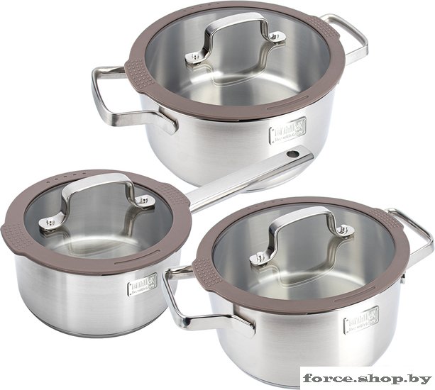| Состав набора | кастрюля 3.9 л с крышкой;###BR###кастрюля 2.1 л с крышкой;###BR###ковш 1.5 л с крышкой. |