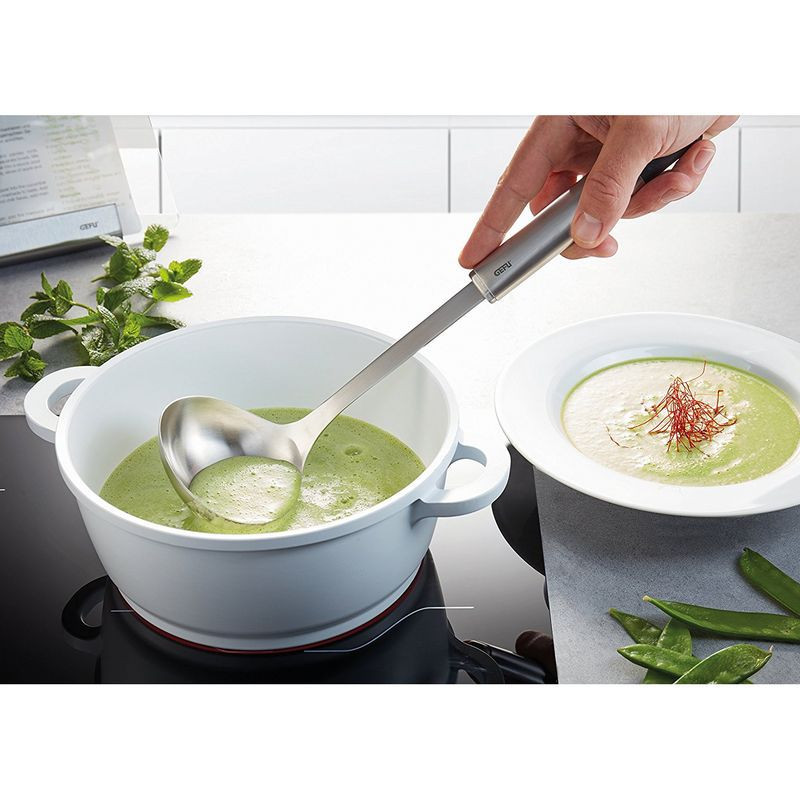 | Информация | - Удобный половник для формирования порций супа, каши, блинного теста и варенья.###BR###- Объем черпака: 100 мл.###BR###- Удобная эргономичная рукоятка.###BR###- Размер: 33,5*9 см.###BR###- Материал: высококачественная нержавеющая сталь, пластик.###BR###- Можно мыть в посудомоечной машине.###BR######BR###GEFU представляет новую серию кухонных аксессуаров PRIMELINE, разработанную в сотрудничестве с компанией INVIVO Design. Эта серия предназначена для удовлетворения всех требований к приготовлению пищи, обжариванию и выпечке. Инструменты серии PRIMELINE имеют эргономичную ручку с продуманным балансом для легкой и комфортной работы. Кроме того, все аксессуары этой серии имеют отверстия для подвешивания, что удобно размещать на кухонном подвесе. |