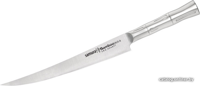 | Информация | Кухонный нож из современной однослойной японской коррозиестойкой стали твердостью 57-59 ед HRC. Уникальная металлическая рукоятка в форме бамбука препятствует скольжению и абсолютно гигиенична. Нож можно использовать не только дома, но и в профессиональном секторе HoReCa, применяются на кухнях кафе и ресторанов. Полноценный стальной клинок от лезвия до хвостовика, тонкий обух и легкость ножа, японская эргономичная форма - все это существенно облегчает работу ножом и доставляет максимум удовольствия! |