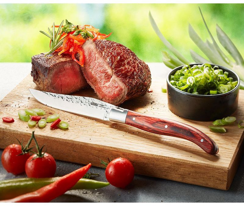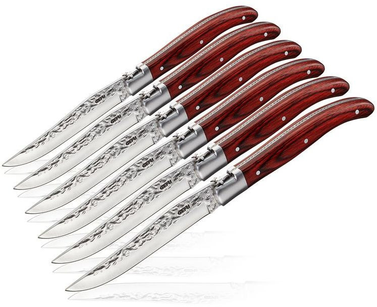 | Информация | - Набор из 6 ножей для стейков в коробке из массива сосны.###BR###- Ручки из дерева ПАККА для удобства использования.###BR###- Декоративная эмблема головы быка на кромке лезвия.###BR###- Чеканная поверхность для предотвращения налипания отрезанного ломтика к лезвию.###BR###- Длина ножа: 22,5 см, длина лезвия: 11 см.###BR###- Размеры коробки: 25*5,5*14,5 см.###BR###- Материал: высококачественная сталь для лезвий, дерево пакка, сосна, медь.###BR###- Не рекомендуется мыть в посудомоечной машине.###BR###- Гарантия 20 лет. |