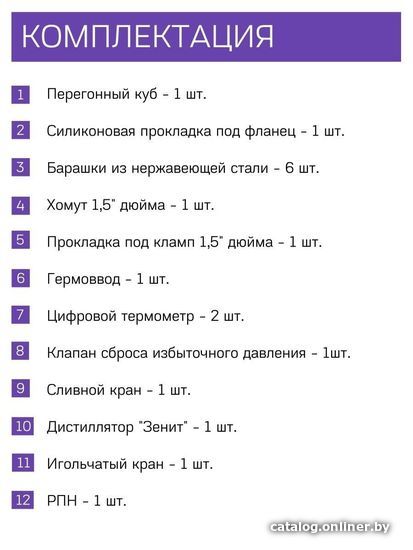 | Информация | Комплектация Перегонный куб Феникс - 1 шт Клапан сброса давления - 1 шт Сливной кран (от 20 л) - 1 шт; Силиконовая прокладка под фланец - 1 шт Барашки из нержавеющей стали - 6 шт; Хомут 1.5 дюйма - 1 шт Прокладка под кламп 1.5 дюйма - 1 шт Гермоввод - 1 шт; Цифровой термометр - 2 шт Фланец-переходник на кламп 1.5 дюйма 10 см - 1 шт; Дистиллятор Зенит - 1 шт Игольчатый кран - 1 шт РПН - 1 шт |