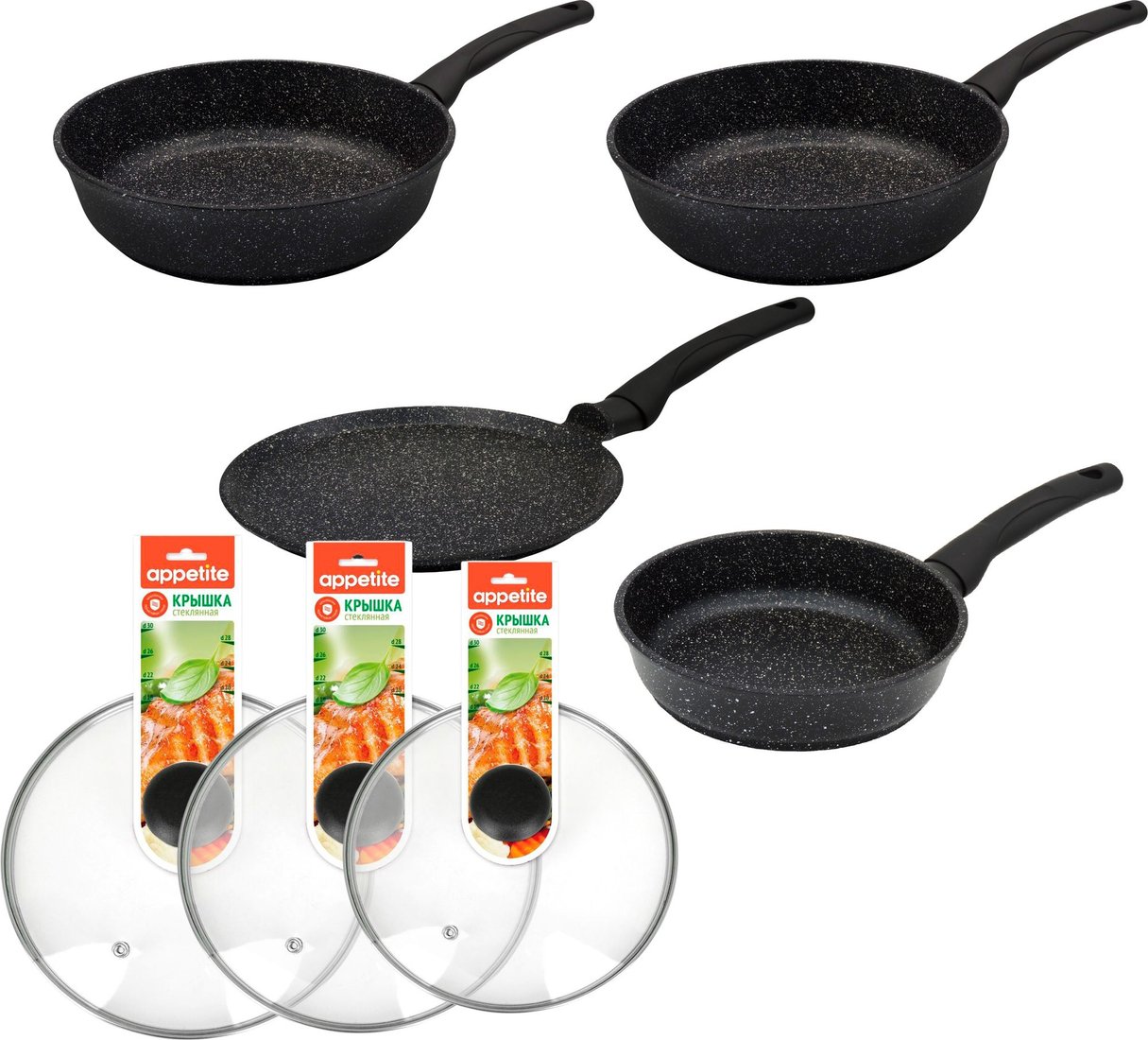 | Состав набора | блинная сковорода, сковорода (3 шт.), крышка (3 шт.) |