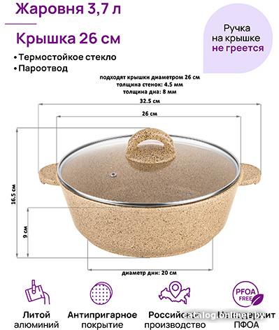 | Информация | ? Жаровня-сотейник «Медовый гранит» из серии «Гармония вкуса» с крышкой и толстым дном равномерно разогревается, сохраняя сочность и полезные свойства продуктов. ? Выполнена в стильном дизайне, имитирующим гранит, из толстостенного литого алюминия с ультрапрочным антипригарным покрытием Cookmark. ? Покрытие устойчиво к царапинам, безопасно для здоровья и не содержит вредных веществ. ? Толстые стены и плотная крышка из жаропрочного стекла создают эффект духовки, обеспечивая равномерную циркуляцию. ?? Эксплуатация: не нагревать без продуктов, использовать только деревянные и силиконовые приборы, не мыть абразивными или щелочными моющими средствами. ? Подходит для всех типов плит, кроме индукционных, и может использоваться в духовом шкафу без крышки при температуре до 250 градусов. ? Кухонный инвентарь в стильном дизайне станет отличным подарком для любой женщины. ? В серии «Гармония вкуса» также представлены сковороды, кастрюли, блинницы, казаны и жаровни. |