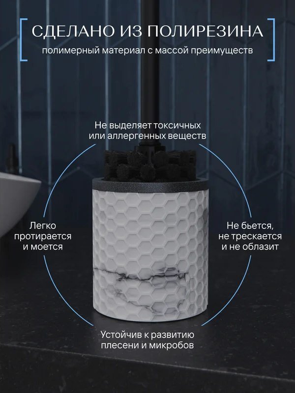| Информация | - Напольный ерш — это аксессуар, который сразу привлекает внимание. Он должен идеально вписываться в интерьер вашей ванной комнаты. - Элегантный минималистичный дизайн ершика дополнен удобной ручкой и жестким ворсом, что делает уборку быстрой и эффективной. - Изделие изготовлено из прочного полирезина, который легко очищается и устойчив к повреждениям. - Преимущества: - Изготовлен из долговечного материала, ручка не подвержена коррозии. - Непористая структура полирезина предотвращает развитие бактерий. - Легкий в уходе, просто моется, обеспечивая чистоту и гигиеничность. - Современный стиль позволяет сочетать его с элементами той же коллекции для создания гармоничной композиции. - |