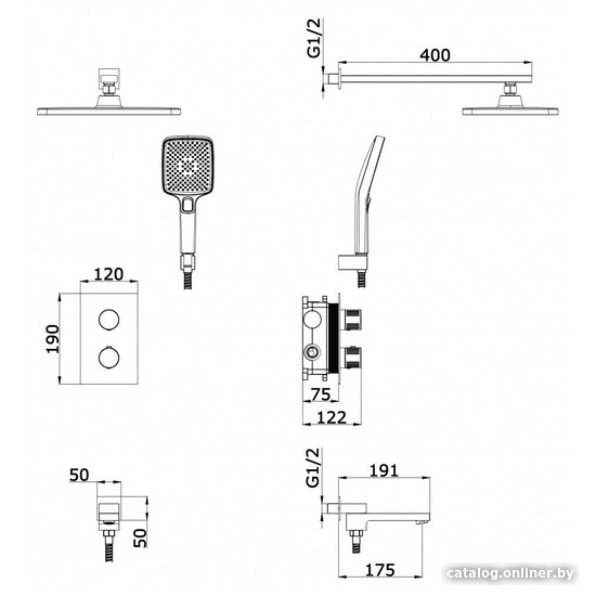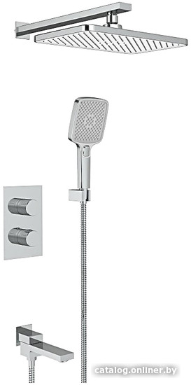 | Комплектация | верхний душ, ручной душ (лейка), держатель лейки, шланг, смеситель, излив для ванны |