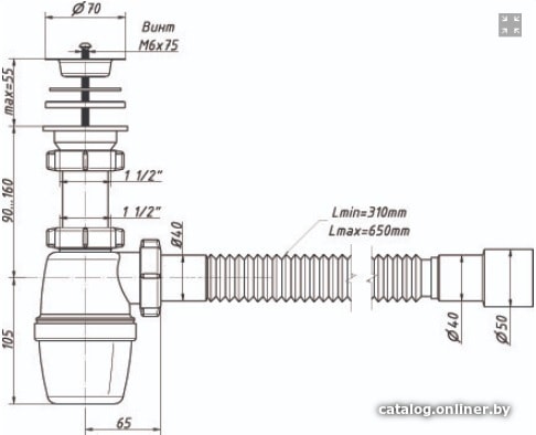 | Информация | Сифон с большим корпусом и отстойником, выпуском, нержавеющей чашкой D70 мм и гибкой трубой 40-40/50 для раковины или мойки. |