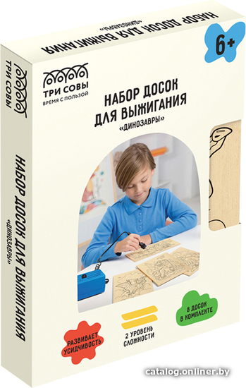 | Информация | Набор досок для выжигания по дереву ТРИ СОВЫ "Динозавры" отличный подарок для ребенка. Для детей выжигание по дереву особенно полезно. Это творческое занятие развивает у них не только воображение, но и усидчивость, терпение, целеустремлённость, уверенные навыки мелкой моторики рук и пальцев. Рисунок на доски нанесен специальными красками, которые при выжигании не выделяют неприятного запаха. Края обработаны лазером, что добавляет работе эстетической красоты и исключает возможность занозить руки во время выжигания. Готовая работа - отличный подарок близким и друзьям! |