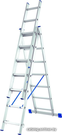 | Информация | Универсальная лестница трехсекционная может использоваться и как стремянка, и как раздвижная лестница. Две высокопрочные ленты и распорки с фиксацией служат для придания устойчивости опоре. Концы стойки с ножками лестницы предотвращают скольжение. Верхняя и центральная части оснащены защитным устройством, предохраняющим от случайного опускания и складывания. Компактная конструкция лестницы облегчает хранение и транспортировку. Легкое обслуживание, безопасное соединение под давлением. |