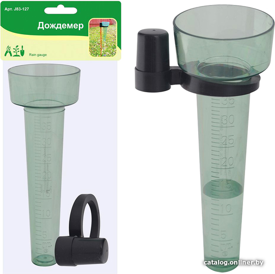 | Информация | Дождемер позволяет определить количество осадков. Приспособление размещается на высоте около 1 м над землей. Дождемер должен устанавливаться вертикально, на расстоянии от зданий, деревьев и других препятствий. Предусмотрено крепление на черенок. Прозрачная емкость позволяет с легкостью определить количество выпавших осадков, которые измеряются в миллиметрах (мм). 1 деление означает 1 мм, это равно 1 л на 1 кв.м. Приспособление подойдёт дачникам, садоводам, фермерам и всем, кому интересно наблюдать за природой. В комплект входит: емкость для измерения осадков, держатель. |
