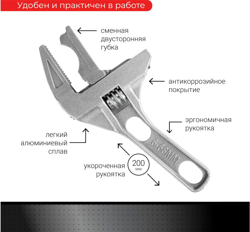 | Информация | - Разводной ключ предназначен для работы с пластиковыми коммуникациями и сантехническими сифонами. - Широкий диапазон раскрытия губок (6–68 мм) позволяет заменить несколько видов ключей одним инструментом. - Двусторонняя подвижная губка с прямой и полукруглой сторонами подходит для работы с различными видами крепежных элементов. - Инструмент изготовлен из алюминиевого сплава с дополнительным покрытием, защищающим от коррозии и окисления. - Укороченная ручка позволяет работать в труднодоступных местах. - Благодаря эргономичной форме рукоятки ключ удобно лежит в руке и не выскальзывает при работе. |