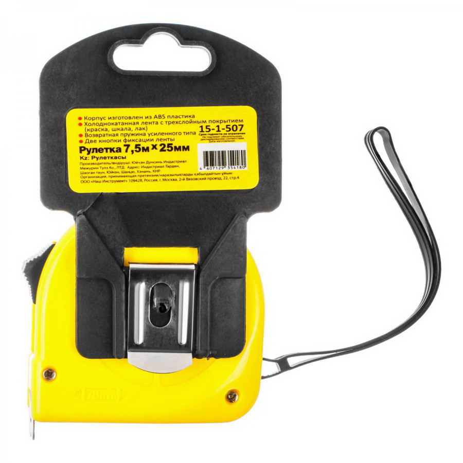 | Информация | Рулетка имеет корпус из ABS-пластика, холоднокатаная лента с трехслойным покрытием (краска, шкала, лак), возвратная пружина усиленного типа, две кнопки фиксации ленты. |
