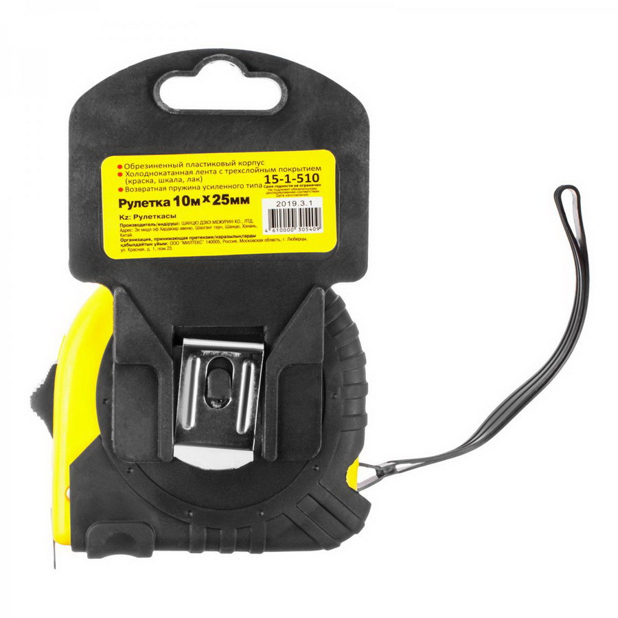 | Информация | Рулетка имеет обрезиненный пластиковый корпус, холоднокатаная лента с трехслойным покрытием (краска, шкала, лак), возвратная пружина усиленного типа. |