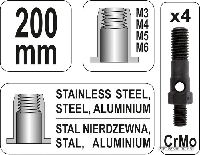 | Информация | Ручной заклепочник для заклепочных гаек М3-М6 фирмы YATO YT-36140. Заклепочник предназначен для соединения материалов с помощью заклепочных гаек. Соединяет материалы с помощью втулки с внутренней резьбой. Это позволяет прикручивать дополнительные элементы саморезами по металлу или саморезами. Головки в размерах: М3, М4, М5, М6. Изготовлен из прочной хромомолибденовой инструментальной стали CrMo. Ручки покрыты нескользящей резиновой подкладкой. |