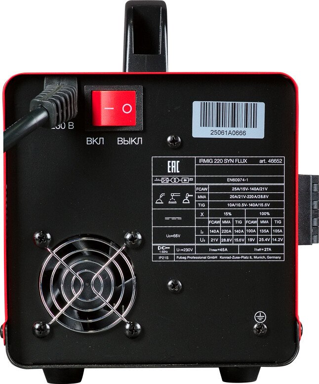 | Информация | -Сварочный полуавтомат FUBAG IRMIG 220 SYN FLUX - это компактный и легкий инвертор для полуавтоматической сварки флюсовой проволокой без газа, а также ручной дуговой сварки (MMA) и аргонодуговой сварки (TIG lift). Аппарат оснащен надежным металлическим корпусом и синергетическим режимом, что обеспечивает быструю и качественную сварку даже для пользователей с небольшим опытом. -IRMIG 220 SYN FLUX идеально подходит для работы как на открытом воздухе, так и в помещениях, не требуя использования защитного газа. Он рассчитан на сварку стали небольших толщин, что делает его отличным выбором для автосервиса, небольших производств и бытового применения. -Аппарат поддерживает работу в трех режимах:полуавтоматическая сварка флюсовой проволокой, MMA и TIG lift. Максимальный ток в режиме MMA достигает 220 А, при этом возможна работа с электродами диаметром от 1.6 мм, а диапазон сварочного тока в режиме MIG FLUX от 25 до 140 А. -FUBAG IRMIG 220 SYN FLUX прост в использовании, оснащается всеми необходимыми кабелями и горелкой для флюсовой сварки, отличается компактными габаритами (320x180x230 мм) и малым весом (5.7 кг), что значительно облегчает его транспортировку и хранение. |