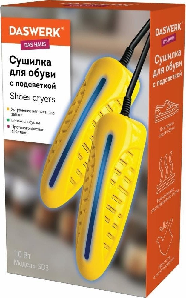 | Информация | ??Текст описания составлен при помощи искусственного интеллекта. - Сушилка для обуви Daswerk SD3 456196 — идеальное решение для поддержания вашей обуви в идеальном состоянии. Благодаря мощному нагревательному элементу мощностью 10 Вт, она эффективно удаляет влагу и неприятные запахи, сохраняя ваши ботинки сухими и комфортными. - Изготовленная из прочного пластика, эта сушилка отличается долговечностью и надежностью. Максимальная температура в 75 °C обеспечивает бережное и безопасное высушивание, не повреждая материалы обуви. - Длина сетевого шнура в 1.1 метра позволяет удобно размещать сушилку в любом месте, не ограничивая ваши действия. Просто вставьте сушилку в обувь, и она начнет работать, обеспечивая вам комфорт и заботу о ваших любимых моделях. - Не забывайте следить за временем работы сушилки, чтобы избежать перегрева и продлить срок службы вашей обуви. |