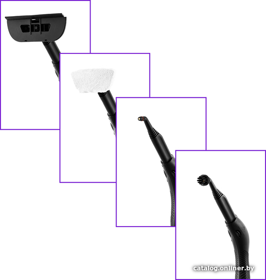 | Дополнительные насадки и приспособления | - тряпка для отпаривания; - латунная щетка; - тряпка для пола; - насадка для отпаривания; - рамка для ковра; - мерный стакан; - круглая нейлоновая щетка; - держатель шнура; - держатель для одежды; - запасные уплотнительные кольца; - колпачок на паровое сопло. |