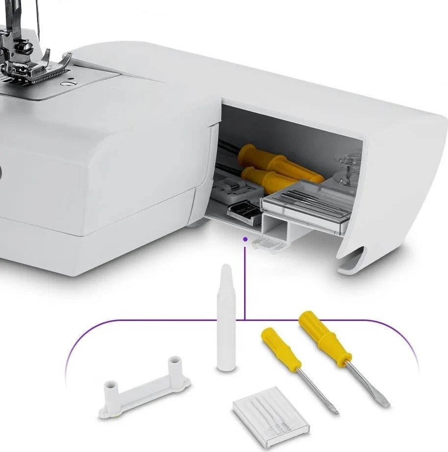 | Комплектация | пластиковые шпульки, вспарыватель, пластина для штопки, набор игл № 90/14, малая и большая отвертки, двойной верхний держатель катушки |