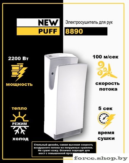 | Информация | Обладает стильным дизайном и самой высокой скоростью воздушного потока из погружных сушилок для рук - более 100 м/с. Не сушит кожу. Отлично подходит для мест с повышенной проходимостью. . |
