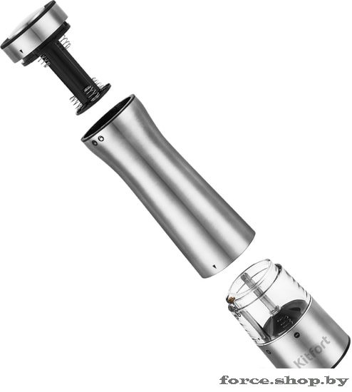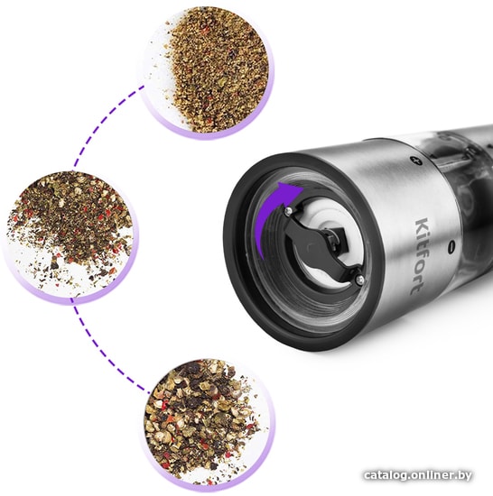 | Информация | Степень помола легко регулируется винтом. Мельница удобно лежит в руке, включается одной кнопкой и работает от 6 батареек типа AАА. Во время помола снизу загорается светодиод, он освещает блюдо, чтобы было лучше видно количество специй. |