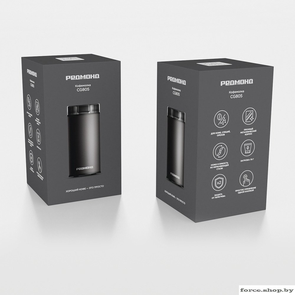 | Информация | - Кофемолка РЕДМОНД CG805 — современный многофункциональный прибор в стильном металлическом корпусе для измельчения кофейных зерен, специй, орехов. За одну загрузку можно измельчить 70 г продукта. Ножи и емкость из нержавеющей стали устойчивы к коррозии и не деформируются при частом использовании прибора. В целях безопасности при критической нагрузке устройство автоматически отключится.###BR######BR###- Для кофе, специй, орехов ###BR###Теперь вы сможете перемолоть не только кофейные зерна. CG805 подходит для измельчения любых пряностей, мускатного ореха, горошков черного перца, семян льна и кунжута.###BR######BR###- Прочный корпус ###BR###Устойчив к мелким царапинам, падениям и бытовым повреждениям. Увесистый металлический корпус будет прочно стоять на столе: достаточно слегка придерживать его рукой в процессе помола.###BR######BR###- Ножи и емкость из стали ###BR###Ножи и емкость кофемолки выполнены из нержавеющей стали: она не впитывает запахи и не влияет на вкус молотого кофе. Лезвия из прочного материала долго прослужат даже без дополнительной заточки.###BR######BR###- Загрузка 70 г ###BR###Перемалывайте зерна ежедневно, чтобы свежий кофе не окислился и не испортился. Емкости 70 г будет достаточно, чтобы подготовить молотый кофе на 5–7 чашек напитка.###BR######BR###- Защита от перегрева ###BR###Кофемолка оснащена системой автоматического отключения при перегреве. Защитные механизмы двигателя оберегают устройство от преждевременной поломки.###BR######BR###- Простое управление ###BR###Не нужно долго разбираться в настройках. Запустить процесс помола очень просто: ###BR###насыпьте продукты в емкость; ###BR###нажмите на кнопку. |
