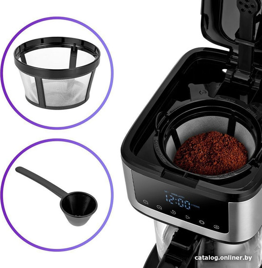 | Информация | ? Капсульная кофеварка КТ-7181 готовит ароматный чёрный кофе из молотого кофе. ? В процессе приготовления вода нагревается в резервуаре, затем подкачивается помпой и подаётся в фильтр с молотым кофе. ? Управление осуществляется при помощи сенсорных кнопок. ? На дисплее отображаются выбранный режим, текущее время или время подогрева. ? Кнопкой «Режим» вы можете выбрать режим приготовления крепкого кофе «STRONG», кофе со льдом «ICED» или обычного кофе. ? Функция отложенного старта позволит начать приготовление кофе в заданное время. ? Кофеварка оснащена нейлоновым фильтром, которым можно пользоваться неограниченное количество раз. ? Фильтр вмещает до 70 грамм молотого кофе, для удобства мерная ложка идёт в комплекте. ? По окончании приготовления кофеварка перейдёт в режим подогрева. ? Платформа с подогревом будет горячей в течение 40 минут, затем кофеварка выключится. ? Для приготовления кофе со льдом в комплекте предусмотрен защитный коврик. ? Кофеварка оборудована противокапельной системой. ? Резервуар кофейника ёмкостью 1,8 л позволяет за один раз приготовить кофе на 14 чашек, ёмкостью 130 мл. ? Корпус кофейника прозрачный, поэтому вы всегда можете контролировать процесс приготовления. |