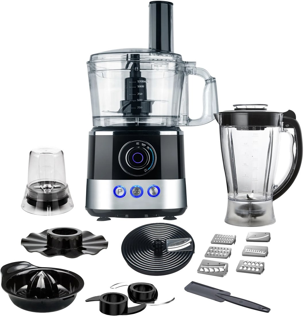 | Полная комплектация | • Моторное основание; • Чаша измельчителя; • Толкатель; • Длинный вал; • Короткий вал; • Блендер с крышкой; • Диск эмульгатор; • Нож для измельчения; • Нож для теста; • Лопатка; • Пластина для лезвий; • Набор лезвий для нарезки – 7 шт (волнообразное лезвие, для нарезки тонких ломтиков, для нарезки толстых ломтиков, для нарезки картофеля фри, для нарезки тонкой соломки, для нарезки толстой соломки, для измельчения); • Соковыжималка; • Кофемолка; • Руководство пользователя |