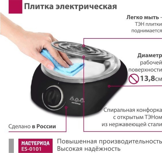 | Информация | - Электрическая плитка с одной спиральной конфоркой и современным дизайном. При весе всего 0.8 кг она способна кипятить 10 литров воды. - Удобное место для хранения шнура позволяет поддерживать порядок на кухне. - ТЭН плитки поднимается вместе с опорой, что значительно упрощает процесс мытья отражателя от остатков пищи. - Корпус плитки практически не нагревается, в отличие от металлических электроплит, что обеспечивает дополнительную безопасность. - Плитка оснащена сетевым индикатором и терморегулятором для удобства использования. |