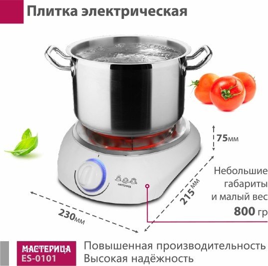 | Информация | - Электрическая плитка с одной спиральной конфоркой и современным дизайном. При весе всего 0.8 кг она способна кипятить 10 литров воды. - Удобное место для хранения шнура позволяет поддерживать порядок на кухне. - ТЭН плитки поднимается вместе с опорой, что значительно упрощает процесс мытья отражателя от остатков пищи. - Корпус плитки практически не нагревается, в отличие от металлических электроплит, что обеспечивает дополнительную безопасность. - Оснащена сетевым индикатором и терморегулятором для удобства использования. |