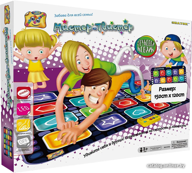 | Информация | Звуковой напольный коврик, поделенный на 20 одинаковых секций с пятью повторяющимися фигурами, и блоком управления с загорающимися кнопками в виде аналогичных фигур. Цель игры: за определенное время нужно наступить ногой или дотронуться рукой до трех сенсорных секторов на коврике, изображения которых совпадают с изображением кнопок, загоревшихся на блоке управления. Во втором режиме играть могут несколько человек одновременно, выбрав каждый для себя определенную фигуру. Прекрасно подходит для веселого времяпровождения как одному, так и в компании друзей. Клавишами «Громкость» можно регулировать силу звука. Для экономии батареек имеется «спящий режим». Не стирать! Загрязнения необходимо удалять влажной тряпкой при выключенном питании. |