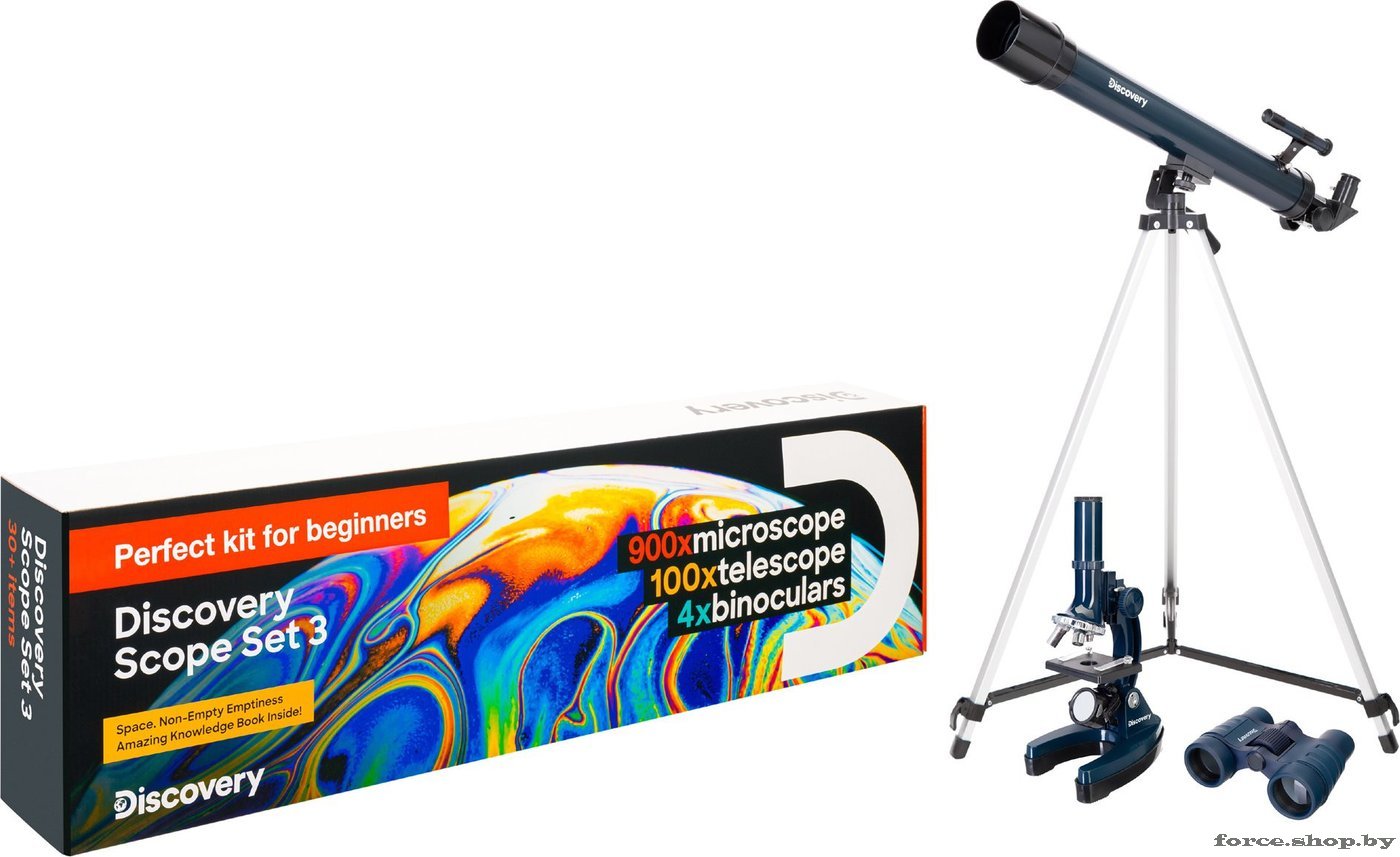 | Информация | - Discovery Channel – это знаменитый научно-популярный телеканал, который погружает зрителей в мир науки, технологий и приключений. Уникальное сочетание историй разных жанров позволяет взглянуть на людей, места и события, формирующие наш мир, с разных ракурсов. Discovery вдохновляет миллионы, открывая новые горизонты и удовлетворяя жажду знаний.###BR######BR###- Мы рады представить серию оптики Discovery, созданную в сотрудничестве с Levenhuk. ###BR######BR###- Набор Levenhuk Discovery Scope 3 включает три оптических прибора для начинающих: биологический микроскоп с нижней подсветкой, телескоп на полноразмерной треноге и компактный бинокль. В комплект также входят более 30 аксессуаров и книга «Космос. Непустая пустота». Этот набор станет отличным подарком для тех, кто увлечен изучением окружающего мира и хочет освоить оптическую технику.###BR######BR###- Телескоп-рефрактор на азимутальной монтировке идеально подходит для первых астрономических наблюдений. С его помощью можно научиться наводить оптическую трубу на небесные объекты, фокусироваться и рассматривать детали Луны. Телескоп также можно использовать для наблюдения наземных объектов. В комплект включены все необходимые аксессуары для немедленного начала исследований.###BR######BR###- Книга «Космос. Непустая пустота» станет отличным помощником в изучении астрономии. Это иллюстрированное пособие знакомит с основами работы с телескопом, его компонентами и правилами наблюдений. В книге также представлена справочная информация о популярных астрономических объектах, написанная простым и доступным языком.###BR######BR###- Биологический микроскоп в наборе предназначен для изучения прозрачных образцов, таких как жизнь в капле воды или готовые микропрепараты. Он обеспечивает увеличение от 150 до 900 крат и оснащен сдвоенной нижней подсветкой, что позволяет удобно работать как при естественном освещении, так и с помощью встроенной лампочки.###BR######BR###- Компактный бинокль Levenhuk Discovery Scope 3 с 4-кратным увеличением идеально подходит для дневных наблюдений. Легкий и портативный, он станет отличным спутником на прогулках, в зоопарках или поездках, позволяя рассмотреть интересные объекты на расстоянии.###BR######BR###- Основные особенности:###BR###• Три оптических прибора, более 30 аксессуаров и книга в комплекте###BR###• Телескоп для наблюдений Луны и наземных объектов###BR###• Микроскоп с нижней подсветкой для изучения прозрачных препаратов###BR###• Карманный бинокль для дневных наблюдений###BR###• Привлекательная упаковка – идеальный подарок###BR######BR###- Комплектация микроскопа:###BR###• Микроскоп###BR###• Окуляр 10х###BR###• Запасная лампочка###BR###• Пустые флакончики (3 шт.)###BR###• Предметные стекла (3 шт.)###BR###• Покровные стекла (3 шт.)###BR###• Наклейки для стекол (3 шт.)###BR###• Скальпель###BR###• Пипетка###BR###• Лопатка###BR###• Пинцет###BR###• Препаровальная игла###BR######BR###- Комплектация телескопа:###BR###• Телескоп###BR###• Окуляр 5 мм###BR###• Окуляр 10 мм###BR###• Оптический искатель 2х###BR###• Диагональное зеркало###BR###• Алюминиевая тренога###BR######BR###- Комплектация бинокля:###BR###• Бинокль###BR###• Мягкий чехол###BR###• Салфетка для оптики###BR###• Тонкий ремешок###BR######BR###- А также:###BR###• Книга «Космос. Непустая пустота»###BR###• Инструкция по эксплуатации и гарантийный талон###BR######BR###© 2022 Discovery, а также соответствующие логотипы и торговые марки являются товарными знаками компании Discovery и ее дочерних 